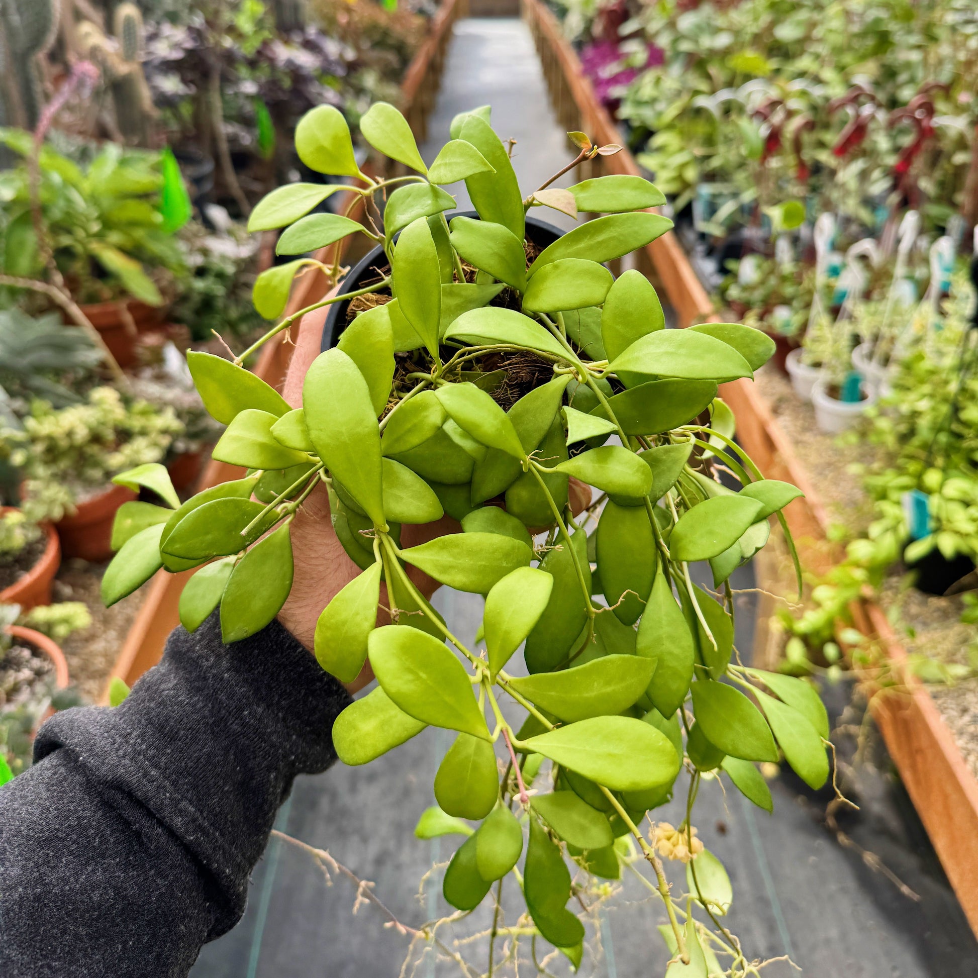 Hoya, more commonly known as wax plants, are a genus of well over 500 different plants. Most of them are either epiphytes or lithophytes, growing on other plants or surfaces. Because they don't typically grow in the ground, Hoya prefer a chunky, well-draining potting mix that doesn't retain water for too long. Keep your Hoya in a space indoors with plenty of bright sunlight and water when the potting mix is almost completely dry.
