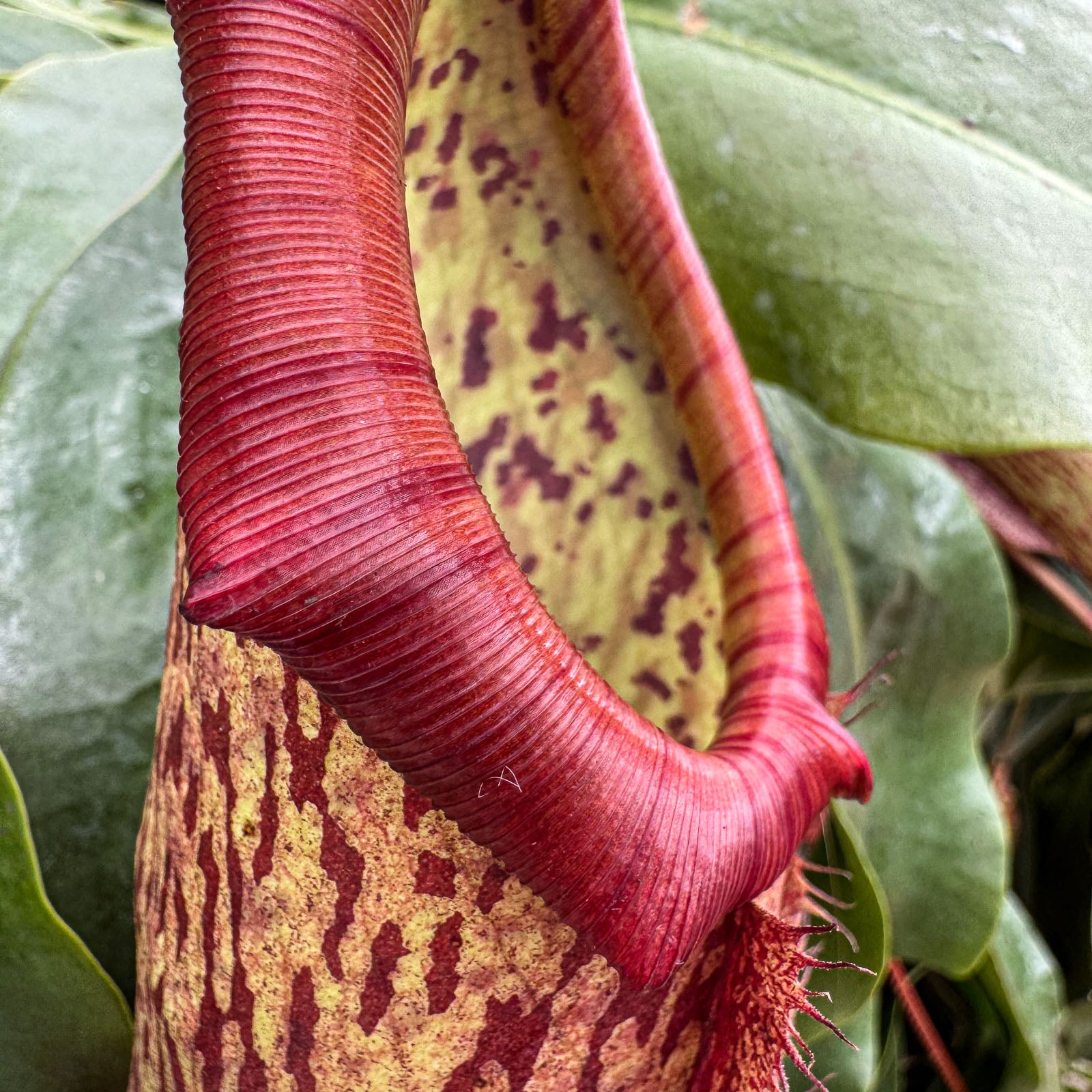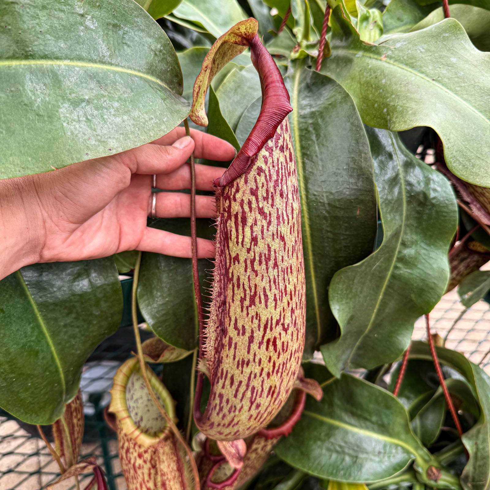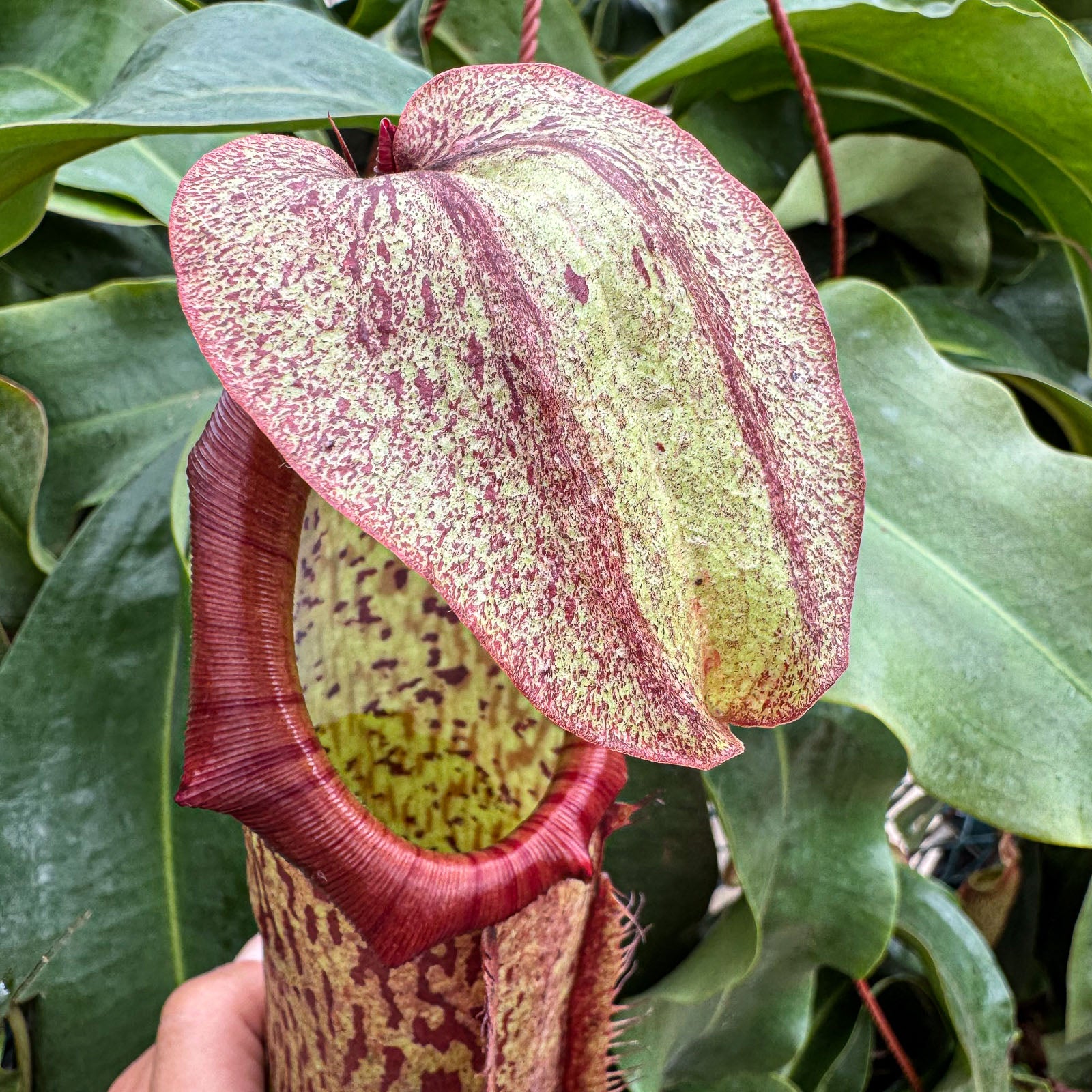 A complex hybrid, most likely derived from Nepenthes northiana and maxima, 'Miranda' is known for its speckled pitchers, dramatically ruffled wings, and striking deep red peristome (the lip of the pitcher). It’s a fast grower, a bug-catching pro, and remarkably forgiving—ideal for beginners and collectors alike.