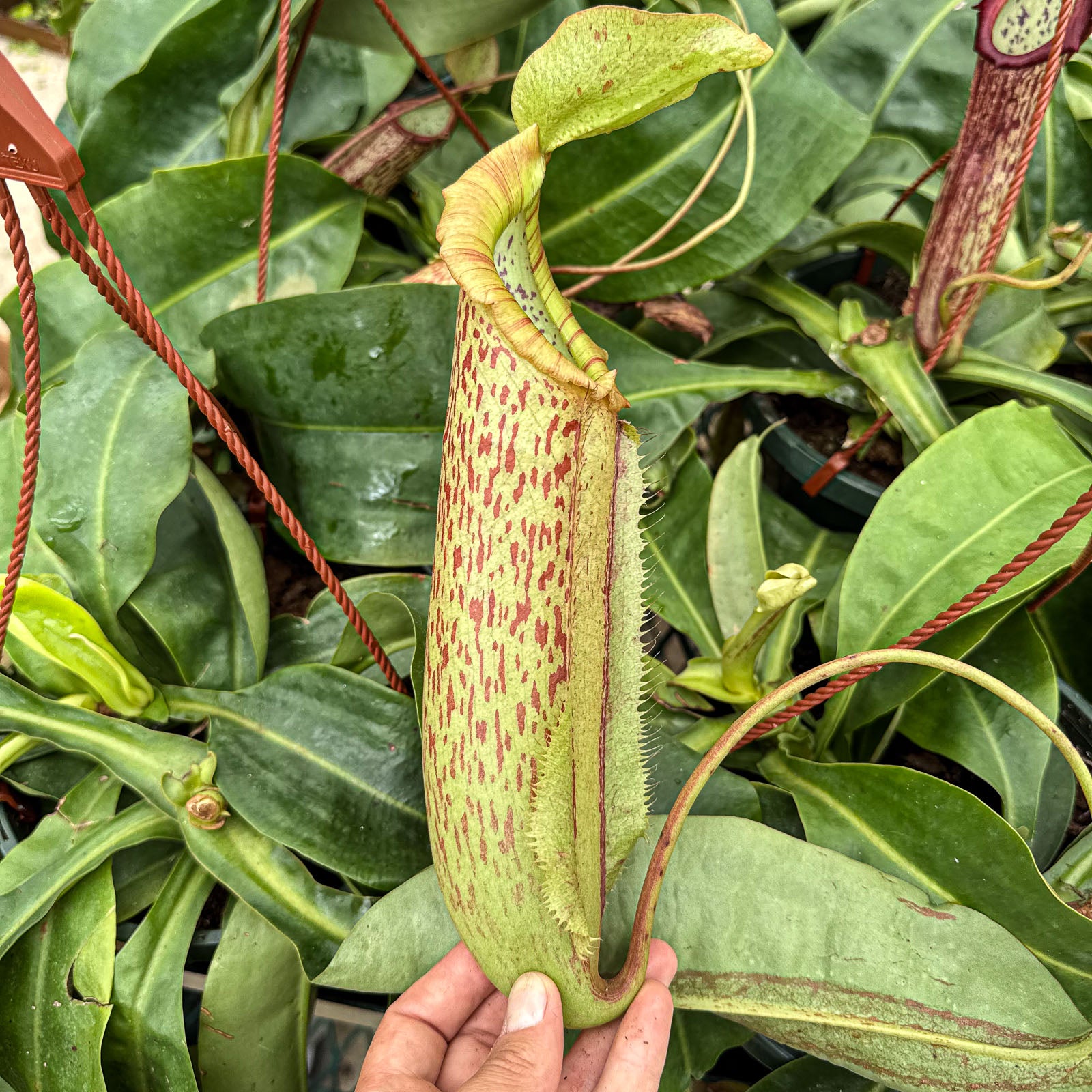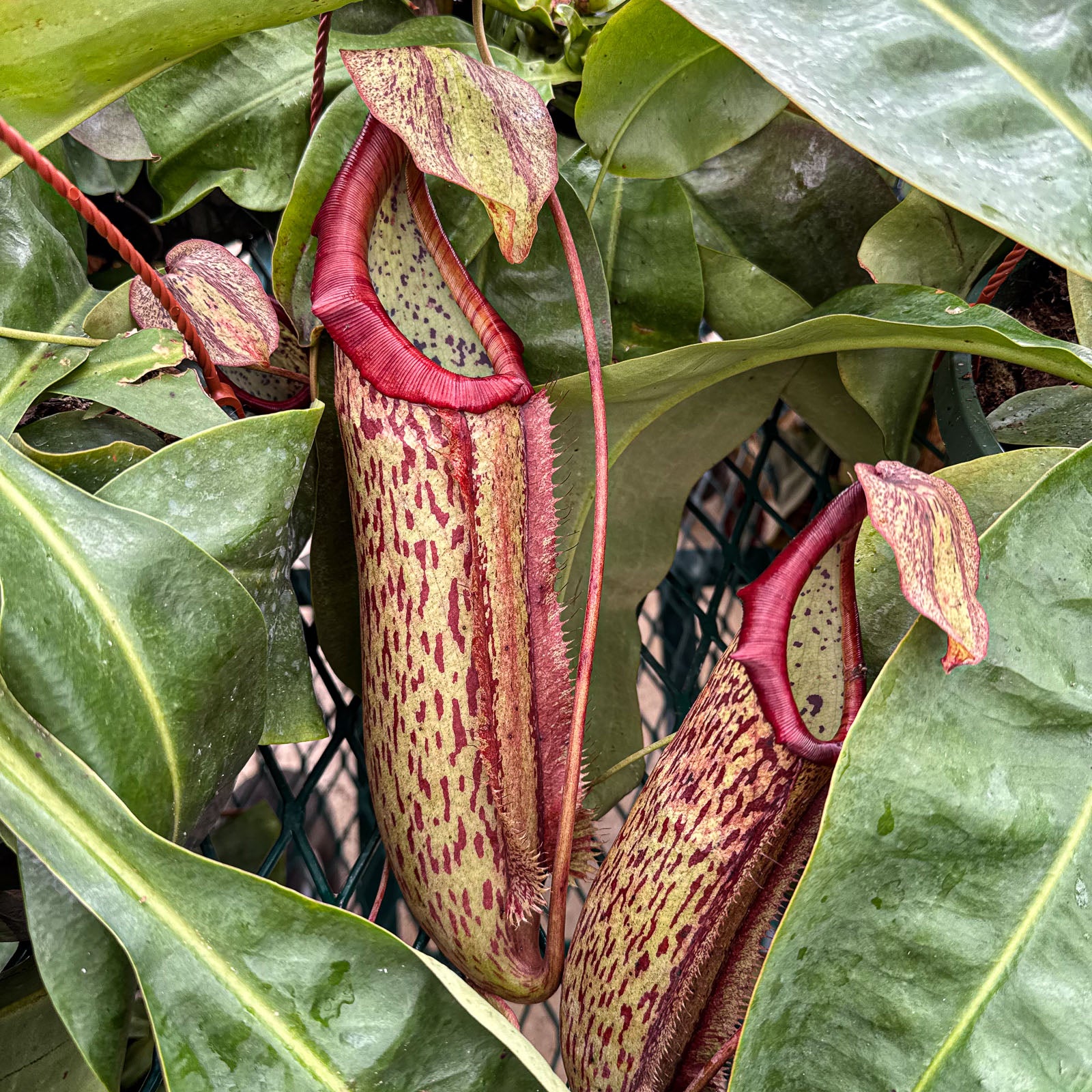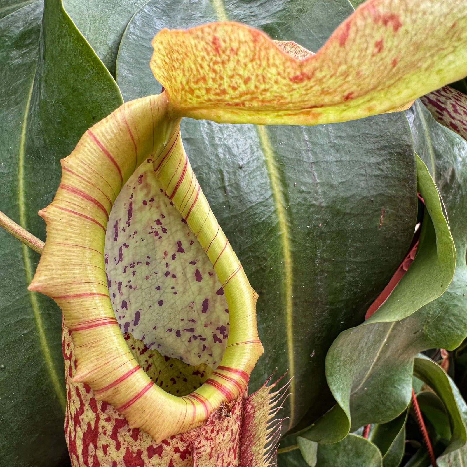 A complex hybrid, most likely derived from Nepenthes northiana and maxima, 'Miranda' is known for its speckled pitchers, dramatically ruffled wings, and striking deep red peristome (the lip of the pitcher). It’s a fast grower, a bug-catching pro, and remarkably forgiving—ideal for beginners and collectors alike.